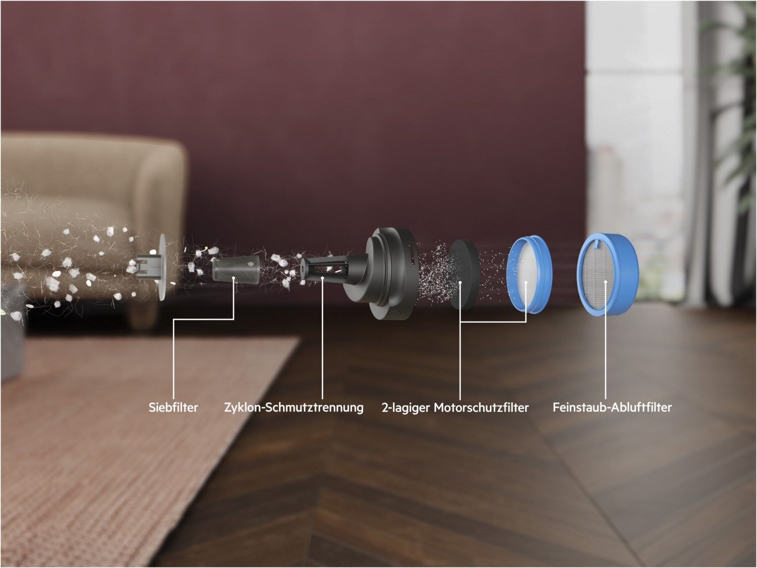 Die verbesserte Zyklon-Grobschmutztrennung bietet eine kompromisslose Saugleistung. Durch die effiziente Trennung der Staubpartikel vom Luftstrom wird mehr Staub und Schmutz im Behälter zurückgehalten, was die Nutzungsdauer des Filters bis zum nächsten Wechsel verdoppelt*.