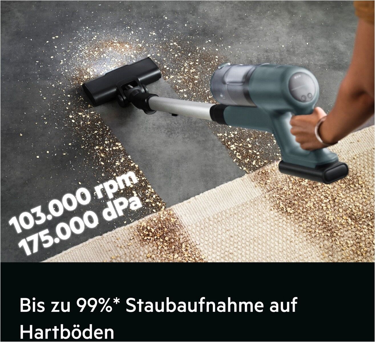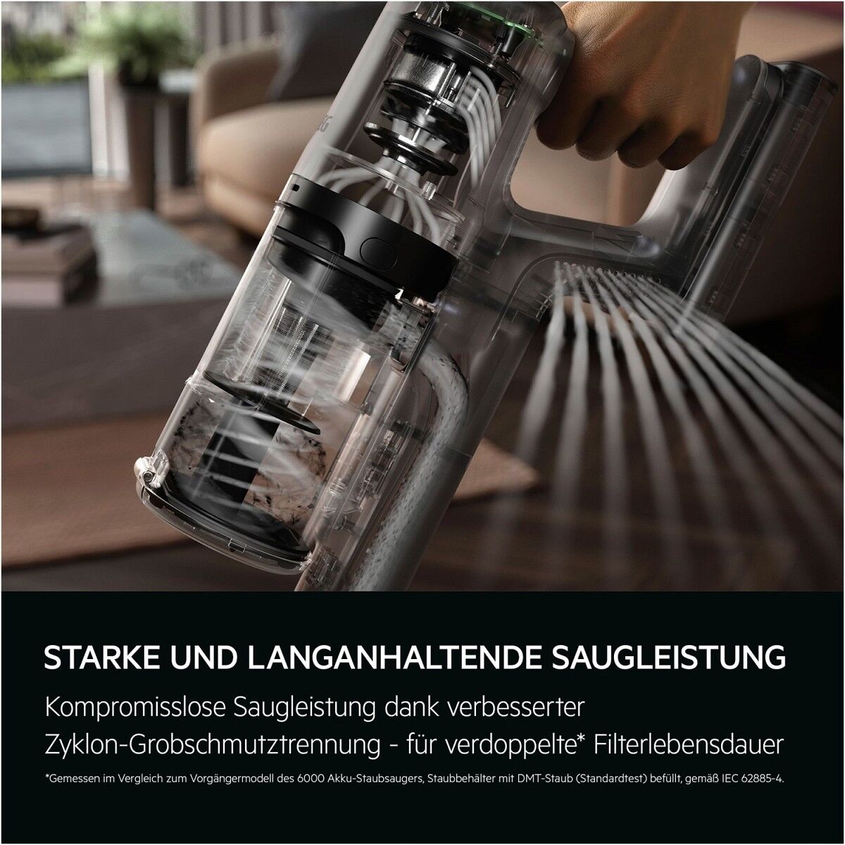 *Gemessen im Vergleich zum Vorgängermodell des 6000 Akku- Staubsaugers, Staubbehälter mit DMT-Staub (Standardtest) befüllt, gemäß IEC 62885-4.