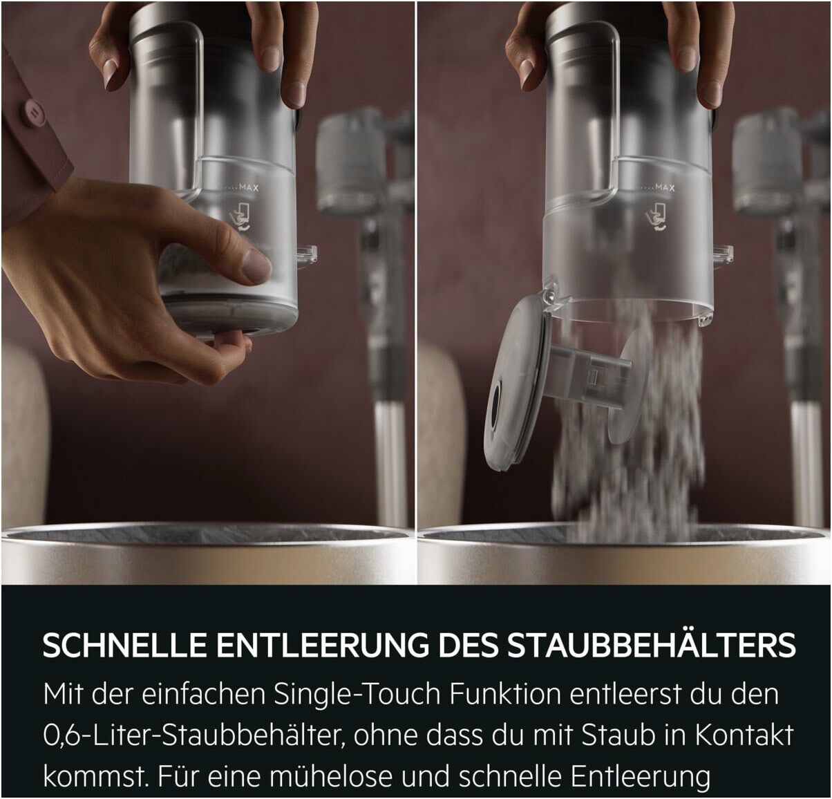 Mit der einfachen Single-Touch Funktion entleerst du den 0,6-Liter-Staubbehälter, ohne dass du mit Staub in Kontakt kommst. Für eine mühelose und schnelle Entleerung.
