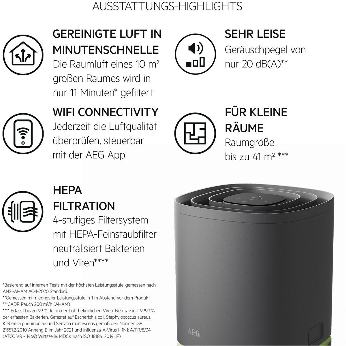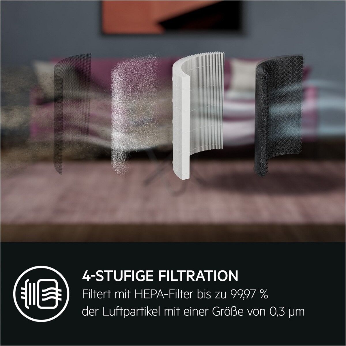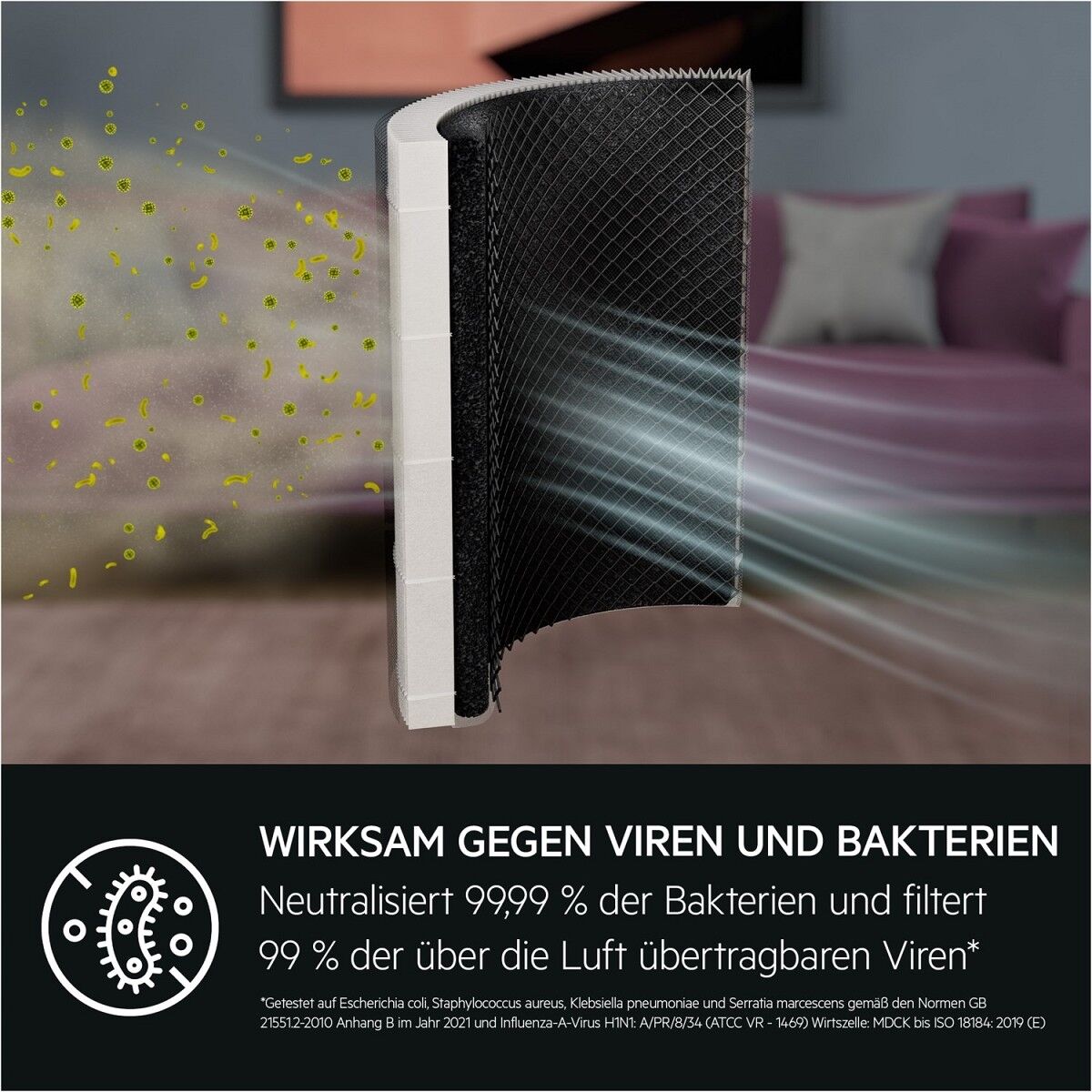 Effiziente Luftreinigung. Einfache Steuerung per App.Das 4-stufige Filtrationssystem des PURE 5000 Luftreinigers sorgt für eine effiziente Reinigung deiner Raumluft und verteilt diese dank spiralförmigem Auslass gleichmäßig. Seine kompakte Größe ermöglicht eine flexible Platzierung. Einfache Steuerung und smarte Auswertung der Luftqualität per App. 4-stufige Filtration mit HEPA-Feinstaubfilter4-stufiges Filtrationssystem reinigt dein Zuhause von z.B. Bakterien, Viren, Hausstaub, Tierhaaren, Gerüchen und Pollen. Das System filtert bis zu 99,7 % der Luftpartikel mit einer Größe von 0,3 μm und beinhaltet: Vorfilter, Bakterien-/Viren-Filterung, HEPA-Filter und Aktivkohlefilter. Vernetztes Erlebnis mit der AEG AppÜberprüfe jederzeit die Luftqualität in deinem Zuhause, passe die Einstellungen und den Zeitplan individuell an, wo immer du bist – dank der AEG App. Anzeige der Filterlebensdauer, Sprachsteuerung und personalisierte Feeds ermöglichen dir, das Beste aus deinem Luftreiniger herauszuholen. Sauberere Raumluft in nur 11 Minuten* Der Luftreiniger filtert die Raumluft eines 10m² großen Raumes in nur 11 Minuten*. Der Spiralauslass erzeugt einen Wirbel, der die saubere Luft effizient im Raum zirkulieren lässt und sie so gleichmäßig verteilt.*Basierend auf internen Tests mit der höchsten Leistungsstufe, gemessen nach ANSI-AHAM AC-1-2020 Standard. Neutralisiert wirksam Viren und BakterienNeutralisiert 99,99 % der eingefangenen Bakterien und filtert 99 % der über die Luft übertragbaren Viren*, damit du und deine Familie gesünder bleiben.*Getestet auf Escherichia coli, Staphylococcus aureus, Klebsiella pneumoniae und Serratia marcescens gemäß GB 21551.2-2010 Anhang B im Jahr 2021 und Influenza A Virus H1N1: A/PR/8/34 (ATCC VR – 1469) Wirtszelle: MDCK gemäß ISO 18184: 2019 (E) Leise und intuitiv: Reinigt die Luft während du schläfstLasse deinen Luftreiniger im Ruhemodus nachts laufen. Mit einem minimalen Geräuschpegel von 20 dB* reinigt er deine Raumluft während du schläfst. *Gemessen mit niedrigster Leistungsstufe in 1 m Abstand vor dem Produkt
