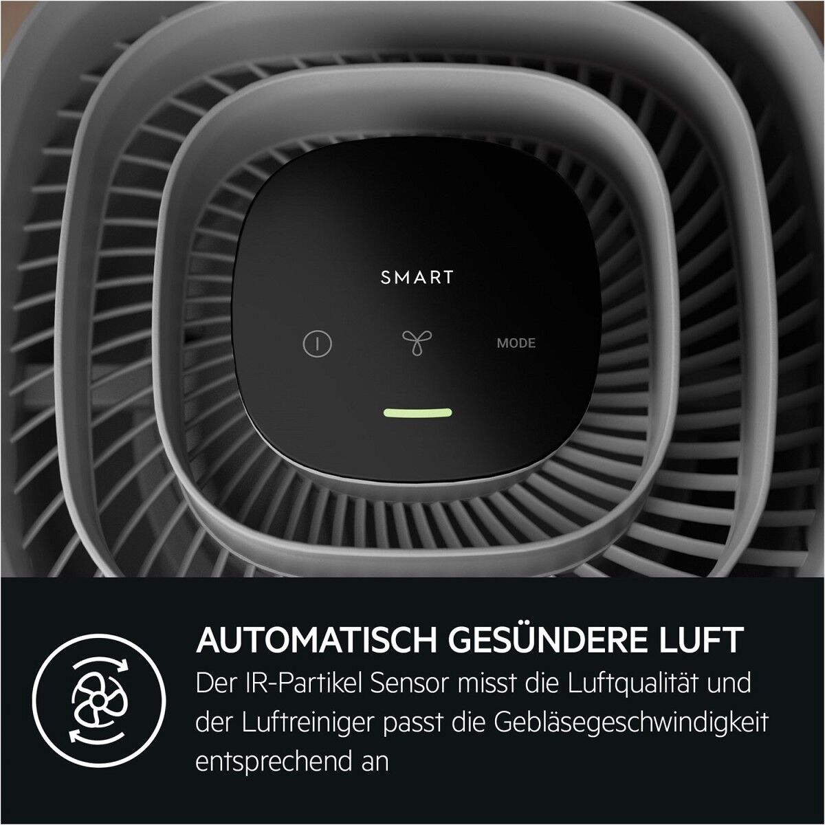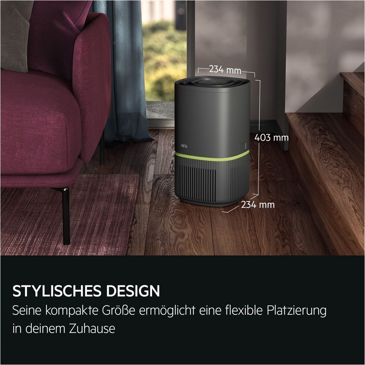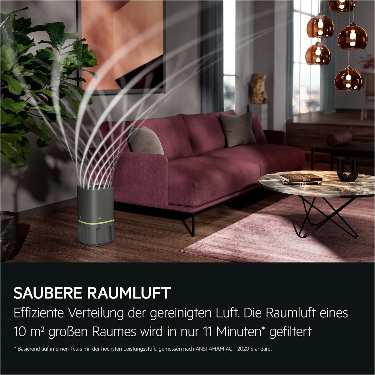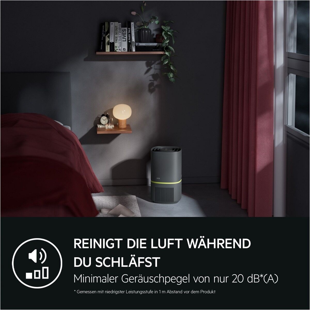 Effiziente Luftreinigung. Einfache Steuerung per App.Das 4-stufige Filtrationssystem des PURE 5000 Luftreinigers sorgt für eine effiziente Reinigung deiner Raumluft und verteilt diese dank spiralförmigem Auslass gleichmäßig. Seine kompakte Größe ermöglicht eine flexible Platzierung. Einfache Steuerung und smarte Auswertung der Luftqualität per App. 4-stufige Filtration mit HEPA-Feinstaubfilter4-stufiges Filtrationssystem reinigt dein Zuhause von z.B. Bakterien, Viren, Hausstaub, Tierhaaren, Gerüchen und Pollen. Das System filtert bis zu 99,7 % der Luftpartikel mit einer Größe von 0,3 μm und beinhaltet: Vorfilter, Bakterien-/Viren-Filterung, HEPA-Filter und Aktivkohlefilter. Vernetztes Erlebnis mit der AEG AppÜberprüfe jederzeit die Luftqualität in deinem Zuhause, passe die Einstellungen und den Zeitplan individuell an, wo immer du bist – dank der AEG App. Anzeige der Filterlebensdauer, Sprachsteuerung und personalisierte Feeds ermöglichen dir, das Beste aus deinem Luftreiniger herauszuholen. Sauberere Raumluft in nur 11 Minuten* Der Luftreiniger filtert die Raumluft eines 10m² großen Raumes in nur 11 Minuten*. Der Spiralauslass erzeugt einen Wirbel, der die saubere Luft effizient im Raum zirkulieren lässt und sie so gleichmäßig verteilt.*Basierend auf internen Tests mit der höchsten Leistungsstufe, gemessen nach ANSI-AHAM AC-1-2020 Standard. Neutralisiert wirksam Viren und BakterienNeutralisiert 99,99 % der eingefangenen Bakterien und filtert 99 % der über die Luft übertragbaren Viren*, damit du und deine Familie gesünder bleiben.*Getestet auf Escherichia coli, Staphylococcus aureus, Klebsiella pneumoniae und Serratia marcescens gemäß GB 21551.2-2010 Anhang B im Jahr 2021 und Influenza A Virus H1N1: A/PR/8/34 (ATCC VR – 1469) Wirtszelle: MDCK gemäß ISO 18184: 2019 (E) Leise und intuitiv: Reinigt die Luft während du schläfstLasse deinen Luftreiniger im Ruhemodus nachts laufen. Mit einem minimalen Geräuschpegel von 20 dB* reinigt er deine Raumluft während du schläfst. *Gemessen mit niedrigster Leistungsstufe in 1 m Abstand vor dem Produkt