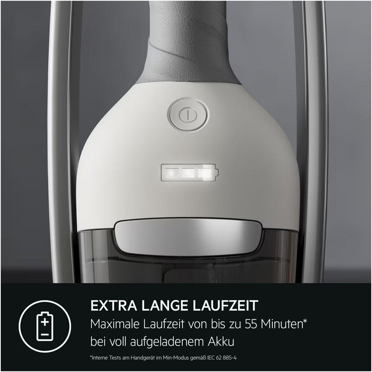 *Interne Tests bestätigen eine Akku-Laufzeit von bis zu 40 Minuten im Min-Modus bei Verwendung einer Elektrosaugdüset. Bis zu 55 Minuten Laufzeit ohne Elektrosaugdüse.