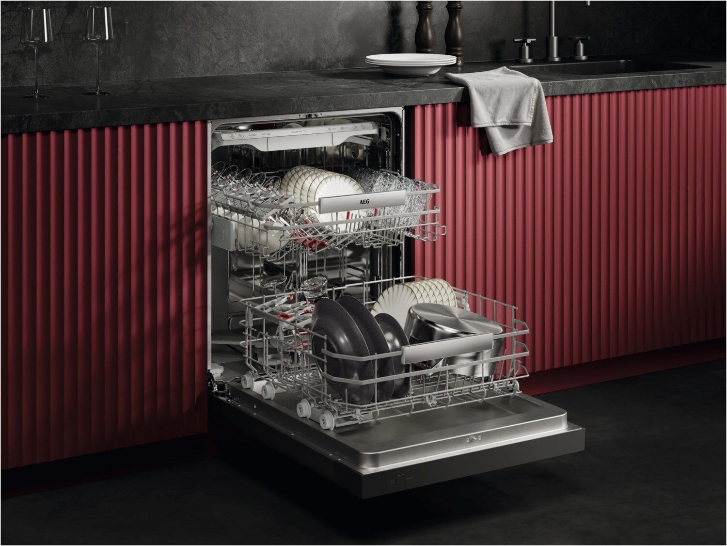 Hervorragende Reinigungsleistung und Wassereffizienz. Multifunktionale Körbe.AEG Geschirrspüler der Serie 9000 sind mit multifunktionalen, leichtläufigen Körben und Besteckschubladen sowie speziellen Halterungen für Gläser und Backbleche ausgestattet. Das hocheffiziente Wassersystem entfernt hartnäckige Speiserückstände bei einem geringen Wasserverbrauch von nur 8.4 Litern. Vielseitige Beladungsmöglichkeiten mit den EasyFlex Pro KörbenDie leichtläufigen EasyFlex Pro Körbe verfügen über vielseitig klappbare Bereiche und Zinken für maximale Flexibilität. SoftGrips und SoftSpikes® fixieren Stielgläser und verhindern Kollisionen. Die Besteckschublade bietet Platz für Schneebesen, Suppenkellen und kleine Tassen. 4in1 FlexHolder für Stielgläser, große Gläser sowie BackblecheDer 4in1 FlexHolder im Unterkorb verfügt über SoftGrips, die dank Anti- Rutsch-Technologie Wein- und Champagner-Gläser sowie große Gläser sicher während des Spülvorgangs halten. Backbleche können im richtigen Winkel fixiert werden, um hartnäckige Speiserückstände zu entfernen. SatelliteClean® Pro: Effiziente Reinigung für hartnäckige SpeiserückständeDer SatelliteClean® Pro Sprüharm mit Doppelrotation erreicht jeden Winkel des Geschirrspülers – für eine 100%ige Entfernung selbst hartnäckiger Speiserückstände wie Eingebranntem in nur 90 Minuten*. Und das ganz ohne zusätzlichen Wasserverbrauch. ZoneClean: Leistungsstark für Töpfe und Pfannen, sanft zu Gläsern Aktiviere ZoneClean, um den Wasserdruck des Sprüharms im Unterkorb für Töpfe und Pfannen zu maximieren und zeitgleich Gläser im Oberkorb sanft zu reinigen. So entstehen zwei separate Reinigungszonen, ohne zusätzlichen Wasser- oder Energieverbrauch. Spart Wasser bei jedem Spülgang. Effizient und leistungsstarkAquaSave aktiviert das Wasserkontrollsystem deines Geschirrspülers, um Wasser nur dort einzusetzen, wo es gerade gebraucht wird. So reduziert sich der Wasserverbrauch auf 8,4 Liter ohne Kompromisse beim Reinigungsergebnis.