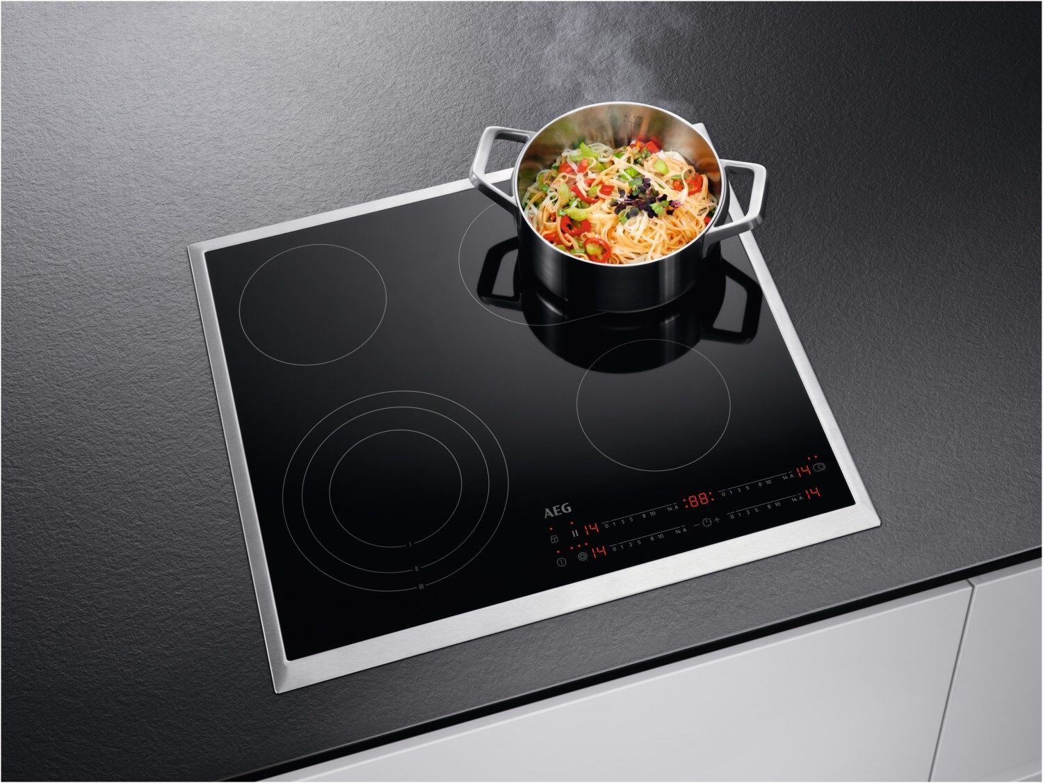 AEG Kochfelder mit DirectTouchSteuere die Bedienoberfläche dieses Kochfelds intuitiv und präzise mit DirectTouch.Die Leistungsstufen lassen sich direkt regulieren. So lässt sich jede Kochzone schnell und übersichtlich steuern und du kannst jedes Gericht so präzise zubereiten, wie du es möchtest. Öko Timer: Geringerer Energieverbrauch dank optimaler Restwärme- NutzungSpare Energie mit dem Öko-Timer. Dieser reguliert die Wärmezufuhr in den letzten Minuten des Kochvorgangs und ermöglicht es dir die Restwärme deines Kochfelds optimal zu nutzen. Mehrzonen-Kochfeld: Optimierte Kochoptionen für verschiedenes KochgeschirrDieses Kochfeld bietet eine Vielzahl von Optionen zum Kochen: Zwei reguläre Kochzonen, eine Dreikreis- Kochzone und eine ovale Mehrzweckkochzone. OptiHeat: Spare Energie durch effiziente Nutzung der RestwärmeDie OptiHeat-Funktion des Kochfeldes ermittelt für jede Kochzone die verbleibende Restwärme, so dass du diese effizienter nutzen und deinen Energieverbrauch minimieren kannst. CountUp-Timer: Schnelle und einfache GarzeitkontrolleDamit du jeden Garvorgang genau verfolgen kannst, beginnt der CountUp-Timer des Kochfelds bei Null und zählt weiter, bis du ihn stoppst oder zurücksetzt.