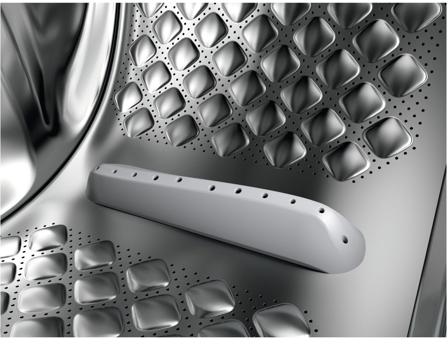 Die AEG-Schontrommel verfügt über eine besondere Kissenstruktur mit sanft abgerundeten Öffnungen und Mitnahmerippen. Deine Textilien gleiten behutsam wie auf einem dünnen Wasserfilm und werden auf diese Weise schonend und energieeffizient bei einem reduziertem Geräuschpegel gewaschen.