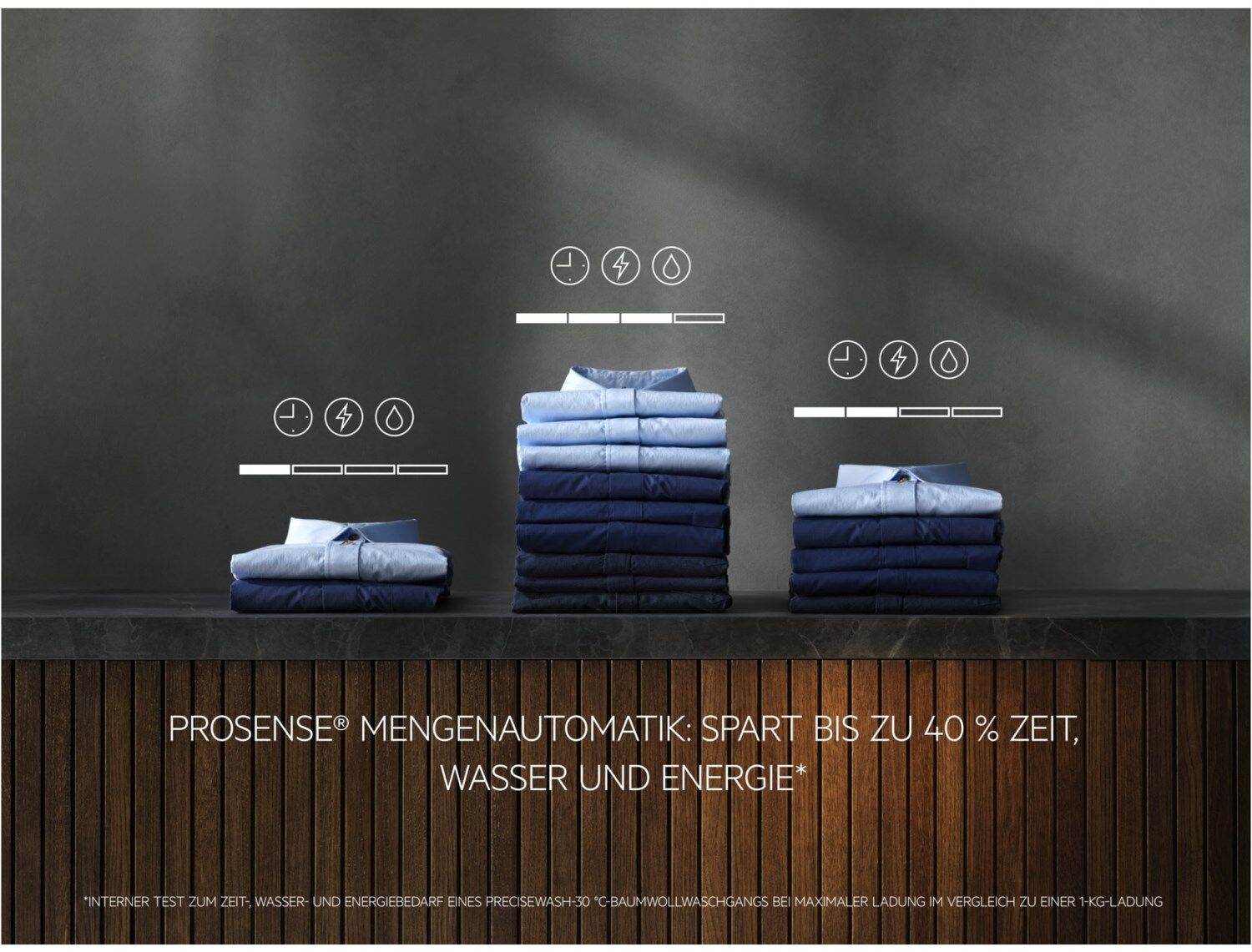 *Interner Test zum Zeit-, Wasser- und Energiebedarf eines ProSense®-30 °CBaumwollwaschgangs bei maximaler Ladung im Vergleich zu einer 1-kg-Ladung