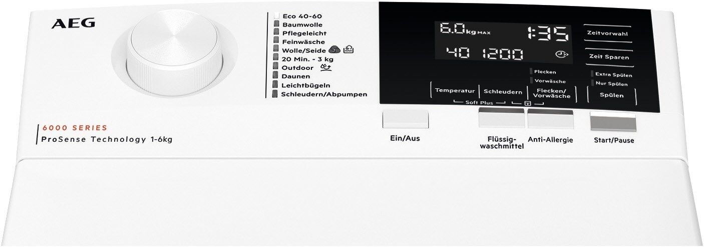 AEG Waschmaschinen der Serie 6000 mit ProSense-TechnologieDie 6000 ProSense®- Waschmaschinen passen Zeit, Wasser- und Energieverbrauch automatisch an die Menge der Ladung an. Egal, ob es sich nur um ein einzelnes Hemd oder deine gesamte Wäsche handelt. Deine Kleidung wird nur so lange gewaschen, wie es erforderlich ist, um Farben und Fasern zu erhalten. ProSense® Mengenautomatik: Spart Wasser, Energie und Zeit.Durch spezielle Sensoren passt sich die Waschdauer und der Energieverbrauch immer an die Menge der Wäsche an. Das spart nicht nur Zeit und Energie, sondern beugt Schäden an Fasern vor und schont so die Kleidung. SoftPlus-Option: Für optimales Waschen mit Weichspüler. Durch einen zusätzlichen Spülgang und eine spezielle Einspültechnik wird die Wäsche optimal auf den Weichspülgang vorbereitet. Der Weichspüler erreicht so jede einzelne Faser deiner Wäsche: Für ein angenehmes Gefühl beim Tragen. SoftOpening- System: Trommeldeckel öffnet sich sanft auf Knopfdruck.Die automatische Trommelpositionierung sorgt dafür, dass die Öffnungstaste an der richtigen Stelle ist, wenn du den Deckel des Topladers entriegeln möchtest. Der Trommeldeckel öffnet sich komfortabel mit Soft-Opening-System. Inverter-Motor: Effizient, leise und langlebig.Inverter-Motor für kompromisslose Leistung, sorgt für einen extrem leisen Betrieb und eine längere Lebensdauer. Zeit Sparen-Option: Spart Zeit und StromMit der Zeit Sparen-Option lässt sich die Programmlaufzeit in zwei Stufen verkürzen und dadurch die Waschdauer um bis zu 50 % reduzieren. Ideal wenn es mal schneller gehen soll: Kürzest mögliche Waschzeit ohne Kompromisse in der Reinigungsleistung.