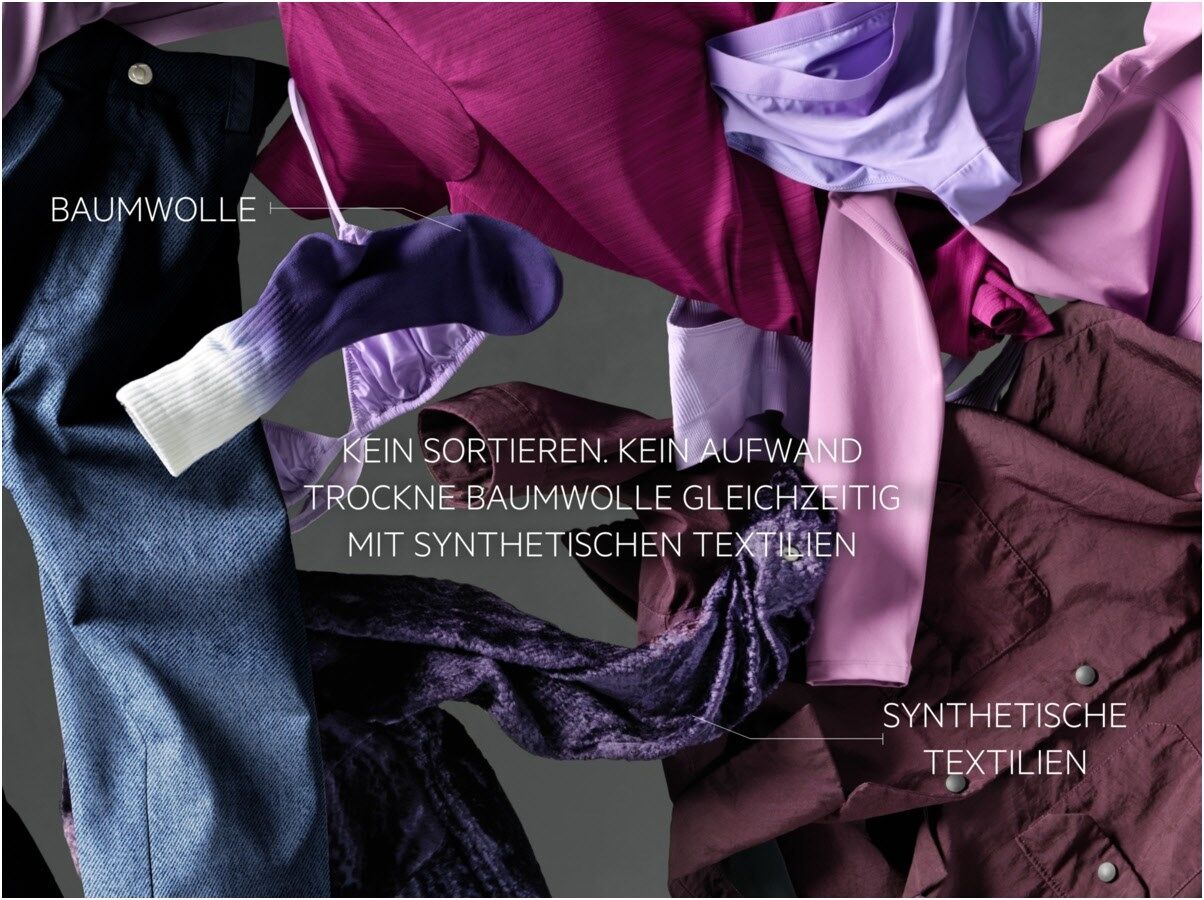 MixDry trocknet deine Kleidungsstücke aus Synthetik und Baumwolle sorgfältig, gleichmäßig und mit der exakt richtigen Temperatur – nicht zu trocken, nicht zu feucht. Ganz ohne Vorsortieren. Die Wärmepumpentechnologie sorgt für das exakte Maß an Temperatur und spart dabei noch Energie.