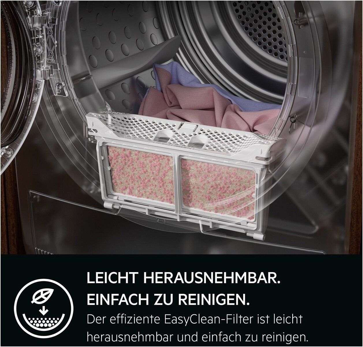 Der EasyClean Filter vereinfacht die Reinigung deines Wäschetrockners. Dieser lässt sich mit nur einem Handgriff herausholen, wie ein Buch aufklappen und reinigen. Entferne die Flusen aus dem Filter für beste Trockenergebnisse, bei weniger Energieverbrauch.