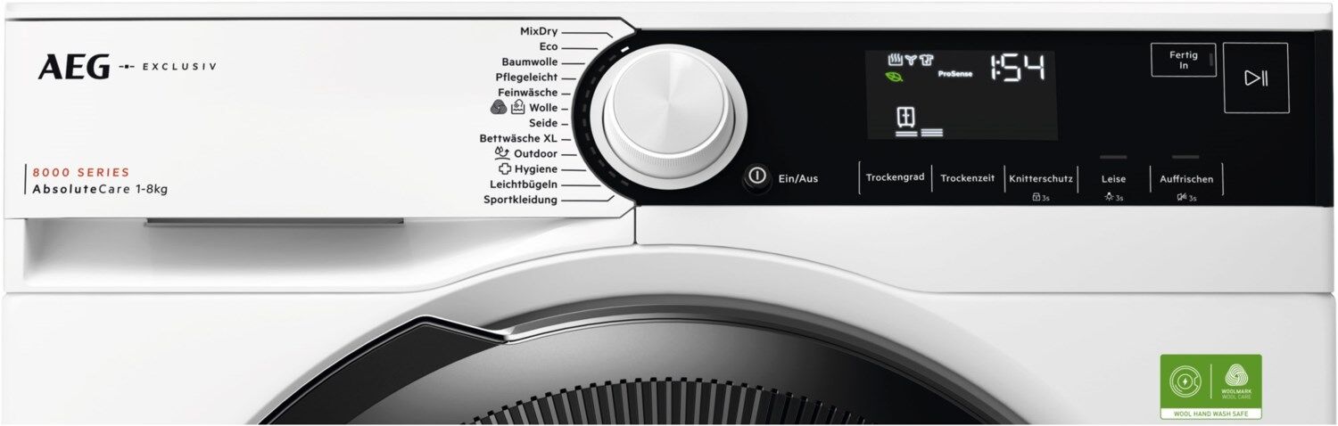 AEG Wäschetrockner der Serie 8000 mit AbsoluteCare® SystemDie 8000 AbsoluteCare® Wäschetrockner mit Wärmepumpentechnologie steuern die Trommelbewegung und -temperatur präzise, wodurch Wolle nicht einläuft und Seide ideal in Form bleibt. Das AbsoluteCare®-System reaktiviert zudem die Imprägnierung deiner Outdoor-Kleidung und wurde mit der Woolmark Blue Zertifizierung ausgezeichnet. AbsoluteCare®: Garantiert kein Einlaufen - auch bei Wolle und Seide*AbsoluteCare® nutzt die Wärmepumpentechnologie zusammen mit präzise gesteuerten Trommelbewegungen, um selbst deine empfindlichsten Kleidungsstücke schonend zu trocknen. Wolle läuft nicht ein, Seide bleibt in Form und sogar die Imprägnierung deiner Outdoor-Bekleidung wird wieder hergestellt.AbsoluteCare®: Garantiert kein Einlaufen - auch bei Wolle und Seide**Vergleichbar mit liegend getrockneter Wolle. MixDry Programm: Kein Vorsortieren. Kein Aufwand.MixDry trocknet deine Kleidungsstücke aus Synthetik und Baumwolle sorgfältig, gleichmäßig und mit der exakt richtigen Temperatur – nicht zu trocken, nicht zu feucht. Ganz ohne Vorsortieren. Die Wärmepumpentechnologie sorgt für das exakte Maß an Temperatur und spart dabei noch Energie.MixDry Programm: Kein Vorsortieren. Kein Aufwand.*Getestet mit einer Mischladung von bis zu 5 kg aus Baumwolle und Synthetik. Das Swissatest zertifizierte Hygiene-Programm beseitigt 99,9 % der Bakterien und Viren*Das Hygiene-Programm trocknet bei 60 °C über einen konstanten Zeitraum und entfernt dadurch 99,9 % der Bakterien und Viren* in der Wäsche.Das Swissatest zertifizierte Hygiene-Programm beseitigt 99,9 % der Bakterien und Viren**Getestet auf Candida albicans, MS2 Bakteriophagen und Escherichia coli in einer externen Untersuchung der Swissatest Testmaterialien AG im Jahr 2021 (Testbericht Nr. 20212038). ProSense® Mengenautomatik: Spart Zeit und EnergieDie innovativen ProSense-Feuchtigkeitssensoren sparen Zeit und Energie. Sie passen den benötigten Zeitaufwand und Energieverbrauch an die Wäschemenge an. So erhält deine Wäsche exakt die richtige Pflege bei jedem Trockenvorgang, für einen langfristig perfekten Look und ein angenehmes Tragegefühl. SensiDry®: weniger Energieverbrauch und gleichmäßige Trocknung deiner KleidungBei der SensiDry®-Wärmepumpentechnologie kommen präzise Sensoren zum Einsatz, die für gleichmäßige Trockenergebnisse sorgen - bei niedrigen Temperaturen. Deine Textilien werden geschont und du sparst Energie.