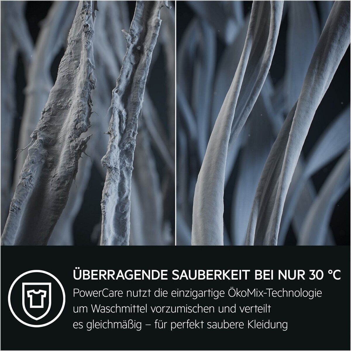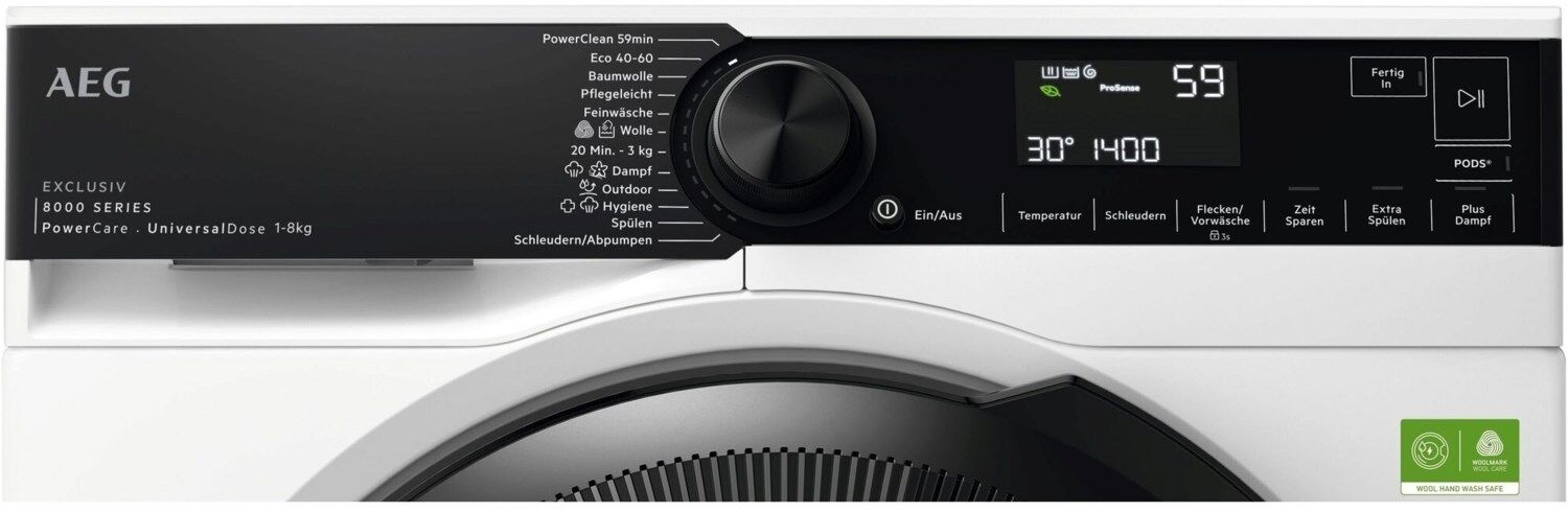 AEG Waschmaschinen der Serie 8000 mit PowerCareDie 8000 PowerCare Waschmaschinen verwenden die einzigartige PowerCare-Technologie, um Waschmittel und Weichspüler effektiv mit Wasser vorzumischen und gleichmäßig auf deiner Kleidung zu verteilen. Aktivierende Waschkraft bereits bei 30 °C für überragende Waschergebnisse in weniger als einer Stunde. PowerClean Programm: Vollständige Fleckenentfernung in 59 Min. bei nur 30 °CDas PowerClean 59 Min.-Programm entfernt Flecken vollständig bei 30 °C in weniger als einer Stunde*. Es stellt sicher, dass das Waschmittel jede Faser erreicht – so dass ein kurzer Waschzyklus genauso effektiv ist, wie ein langer und Flecken nachweislich rückstandslos entfernt werden.POWERCLEAN 59 MIN. VÖLLIGE FLECKENENTFERNUNG, AUCH BEI NIEDRIGEN TEMPERATUREN**Externer Test des PowerClean 59 Min.-Programms bei 30 °C mit 5 kg Ladung zeigt 100 % Fleckenentfernung von den 59 häufigsten Haushaltsflecken. UniversalDose-Schublade: Löst PODS®/CAPS 60 % schneller auf*Die UniversalDose-Schublade löst durch die fortschrittliche Wasserwirbel- Technologie Waschmittel-PODS® und Caps 60 % schneller auf im Vergleich zur Trommelbeigabe. Das steigert die Reinigungsleistung und Fleckentfernung bei Kurz- und Niedrigtemperatur- Programmen.** Interner Test mit einem einstündigen Baumwollprogramm bei 30 °C, bei dem die PODS® in der UniversalDose-Schublade mit den PODS® in der Trommel verglichen wurden ProSteam Dampf-Programm: Mehr Frische und weniger Falten für deine Textilien*Das Dampf-Programm neutralisiert Gerüche* und reduziert Knitterfalten auf Kleidungsstücken, einschließlich Feinwäsche, in nur 25 Minuten. Für einen zusätzlichen Frische-Effekt füge einfach den AEG Steam Fragrance Wäscheduft hinzu.ProSteam Dampf-Programm: Mehr Frische und weniger Falten für deine Textilien**Externer Test zeigt die Neutralisierung von Zigarettengeruch im Dampf- Programm. ProSense® Mengenautomatik: Spart bis zu 30 % Wasser, Energie und ZeitDie Sensoren der ProSense® Mengenautomatik ermitteln automatisch die Wäschemenge für einen maßgeschneiderten Waschzyklus. Zeit-, Wasser- und Energieverbrauch werden um bis zu 30 %* gesenkt. So erhält deine Wäsche exakt die richtige Pflege bei jedem Waschvorgang.*Interner Test für Zeit, Wasser- und Energieverbrauch eines 30 °C-Baumwollprogramms optimiert mit ProSense® für eine Beladung von 1 kg gegenüber maximaler Beladung. AEG-Schontrommel: Behutsamer Umgang mit deinen Textilien*Die AEG-Schontrommel verfügt über eine besondere Kissenstruktur mit sanft abgerundeten Öffnungen und Mitnahmerippen. Deine Textilien gleiten behutsam wie auf einem dünnen Wasserfilm und werden auf diese Weise schonend und energieeffizient bei einem reduziertem Geräuschpegel gewaschen.AEG-Schontrommel: Behutsamer Umgang mit deinen Textilien**Gemäß internen Tests zum Vergleich der AEG-Schontrommel mit der AEG Standard Trommel