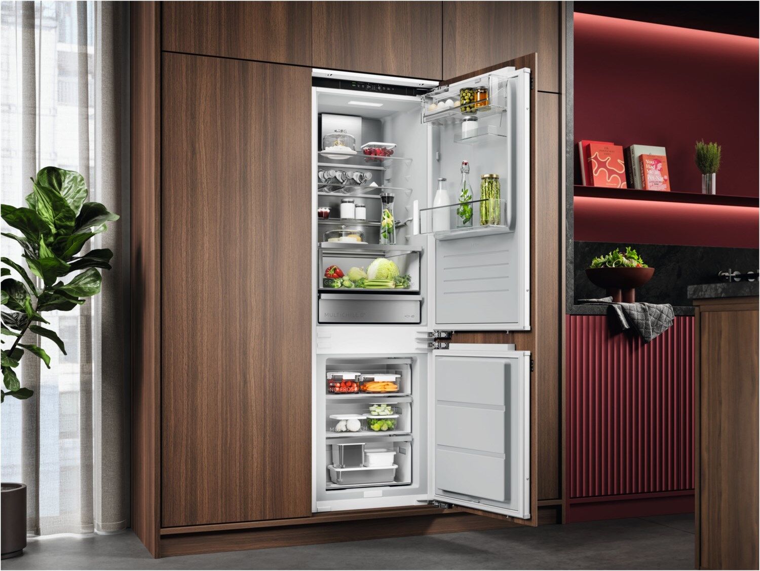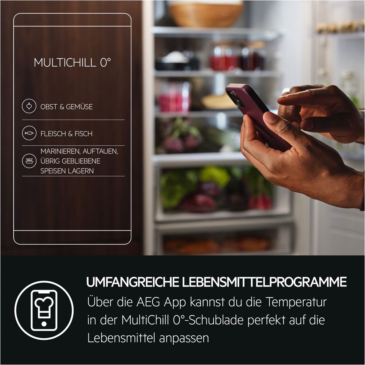 AEG Kühl-Gefrierkombinationen der Serie 9000 mit MultiChill 0°-Schublade Die 9000 Kühl-Gefrierkombinationen mit MultiChill 0° bereiten deine Zutaten optimal fürs Kochen vor. Ob beim Gären von Teig, Auftauen, Marinieren von Zutaten oder Aufbewahren von übrig gebliebenen Speisen - das Ergebnis ist ein hervorragender Geschmack und weniger Food Waste. MultiChill 0°- Schublade: Maximal flexible Kühlung für langanhaltende FrischeNutze die MultiChill 0°-Schublade zur Kühlung von Fisch und Fleisch, zum sicheren Auftauen von Gefriergut, zur längeren Aufbewahrung übrig gebliebener Speisen oder als zusätzliche Gemüseschublade. Die unabhängige Temperaturregelung der Schublade bietet dir einen personalisierbaren Kühlbereich. AEG App: Herausragendes Kochen beginnt im KühlschrankWähle dank umfangreicher Programme in der AEG App genau den richtigen Temperaturbereich in der MultiChill 0°-Schublade – für ein sicheres Auftauen von Lebensmitteln, lange Frische für übrig gebliebene Speisen oder die perfekte Temperatur für das Gären deines Brotteigs. 70 % Recycelter Kunststoff* - ohne Kompromisse bei Qualität und LeistungDie Innenauskleidung der AEG Kühl-Gefrierkombination besteht aus 70 % recyceltem Kunststoff. Der Kunststoff aus alten Kühlschränken wird für die Herstellung neuer Kühlschränke genutzt und trägt so zur Abfallvermeidung durch Kreislaufwirtschaft bei.*Innenauskleidung besteht aus bis zu 70 % recyceltem Kunststoff rHIPS. *Die Innenauskleidung besteht zu 70 % aus recyceltem Kunststoff, der 13 % des gesamten Kunststoffes des Kühlschranks ausmacht. GreenZone+: Schützt die Frische von Obst und Gemüse – ganz automatischVollständig getrennt vom Rest des Kühlbereichs sorgt die GreenZone+ Schublade für optimale Luftfeuchtigkeit. Die innovative Membran entfernt automatisch überschüssiges Kondenswasser und erhält so bis zu 95 % der Vitamine* nach 11 Tagen – für weniger Food Waste und besseren Geschmack.GreenZone+: Schützt die Frische von Obst und Gemüse – ganz automatisch*Wert zum Vitaminerhalt basierend auf einem externen Test über den Erhalt von Vitamin C in Blaubeeren nach 11 Tagen im GreenZone+ Fach. Dein individuelles Gefrierfach: Flexible Frische für deine LebensmittelGenieße die Flexibilität deiner Kühl-Gefrierkombination dank des MultiSwitch, das sich an deine individuellen Bedürfnisse anpasst. Du kannst das Gefrierfach auf +4 °C einstellen, um den Kühlraum zu erweitern, oder es bei seiner üblichen Temperatur zwischen -15 °C und -24 °C nutzen.