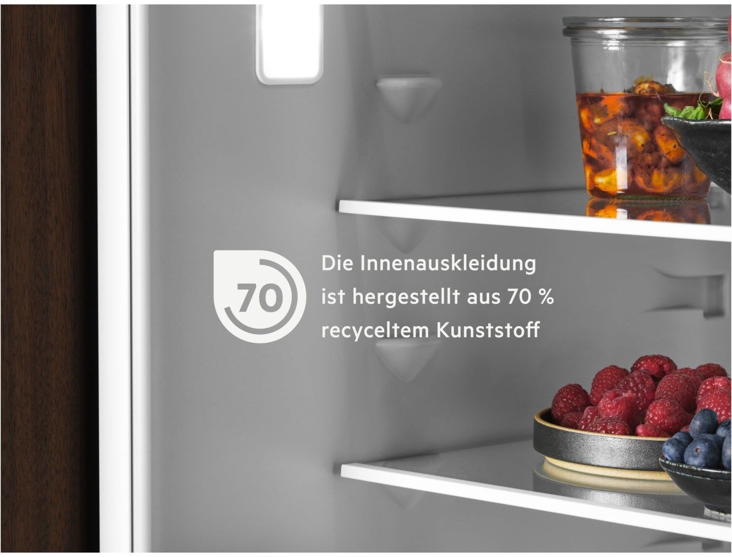 70 % Recycelter Kunststoff* - ohne Kompromisse bei Qualität und LeistungDie Innenauskleidung der AEG Kühl-Gefrierkombination besteht aus 70 % recyceltem Kunststoff*. Der Kunststoff aus alten Kühlschränken wird für die Herstellung neuer Kühlschränke genutzt und trägt so zur Abfallvermeidung durch Kreislaufwirtschaft bei.*Die Innenauskleidung besteht zu 70 % aus recyceltem Kunststoff, der 13 % des gesamten Kunststoffes des Kühlschranks ausmacht.
