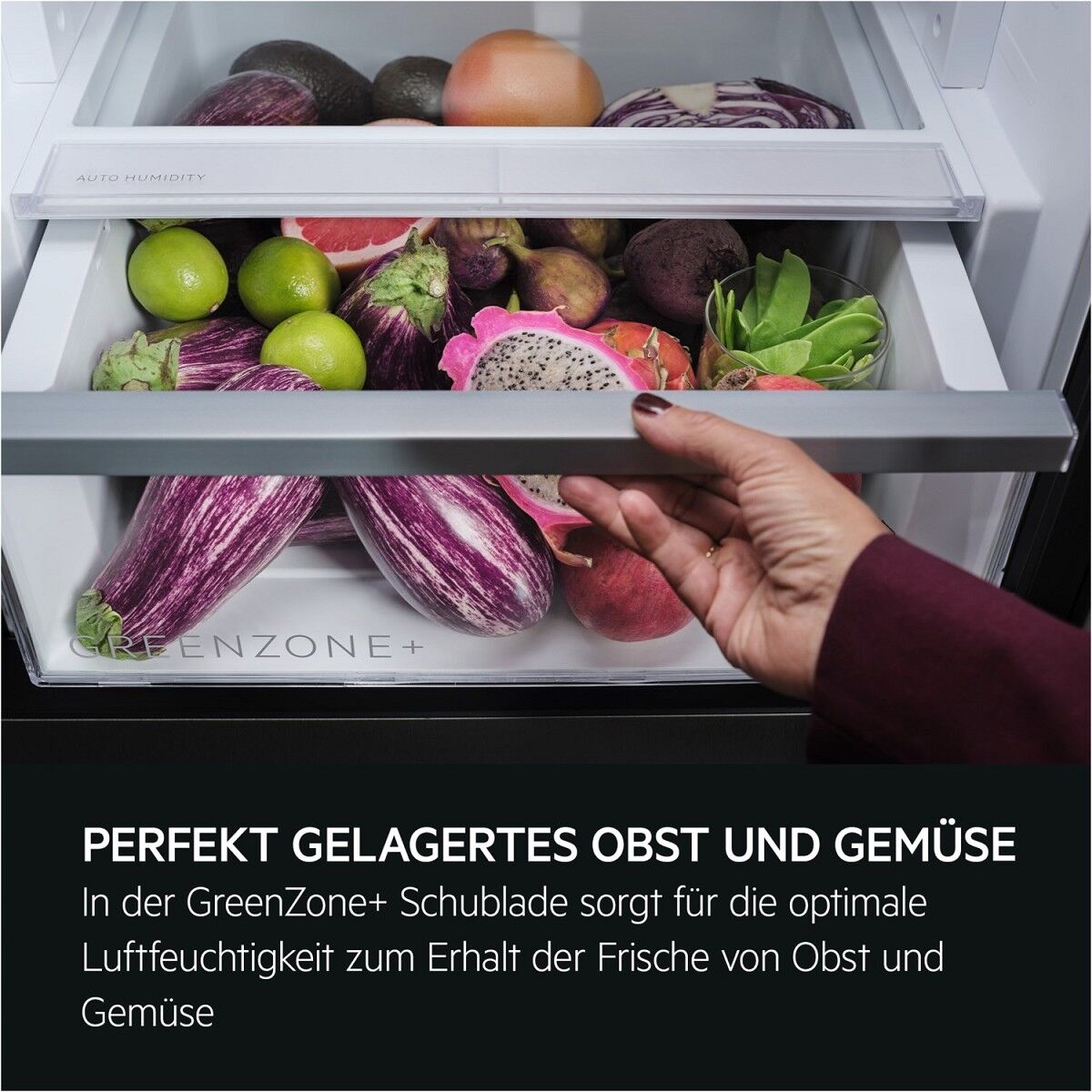 GreenZone+: Schützt die Frische von Obst und Gemüse – ganz automatischVollständig getrennt vom Rest des Kühlbereichs sorgt die GreenZone+ Schublade für optimale Luftfeuchtigkeit. Die innovative Membran entfernt automatisch überschüssiges Kondenswasser und erhält so bis zu 95 % der Vitamine* nach 11 Tagen – für weniger Food Waste und besseren Geschmack.GreenZone+: Schützt die Frische von Obst und Gemüse – ganz automatisch*Wert zum Vitaminerhalt basierend auf einem externen Test über den Erhalt von Vitamin C in Blaubeeren nach 11 Tagen im GreenZone*+ Fach.