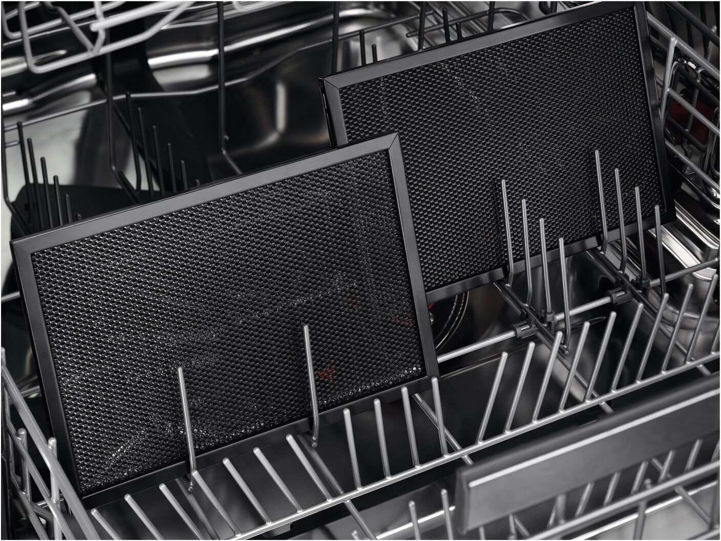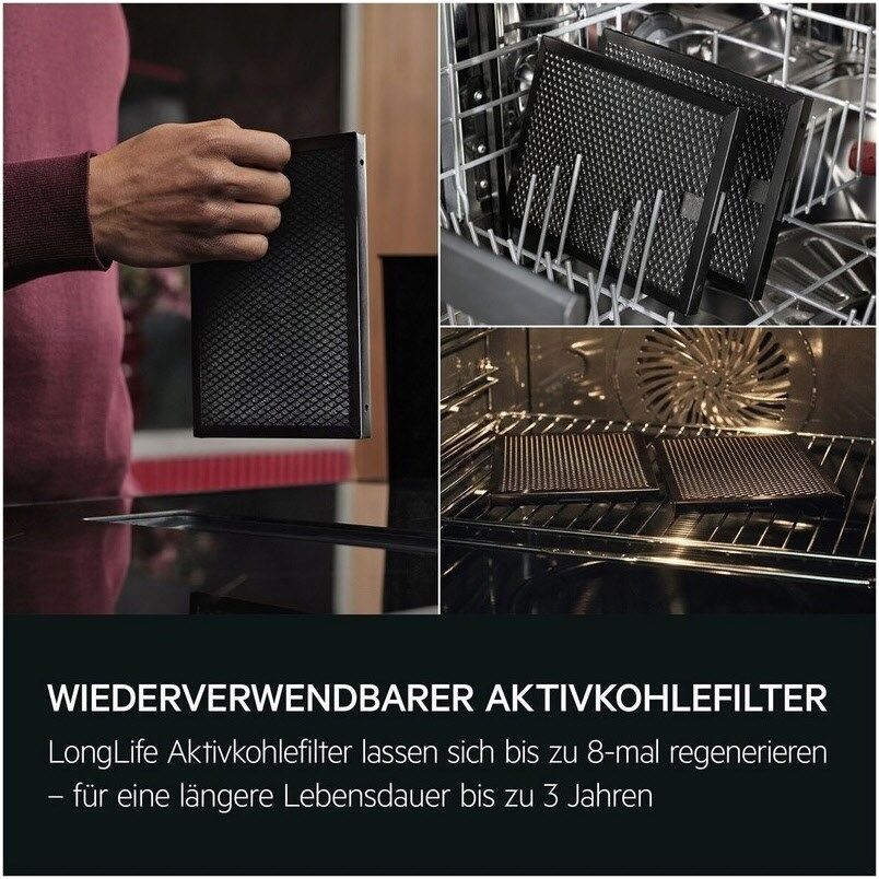 LongLife Aktivkohlefilter: Komfortable Reinigung, mehrfache WiederverwendungDer Aktivkohlefilter kann bis zu 8-mal im Ofen regeneriert werden, was einer Lebensdauer von etwa 3 Jahren entspricht. Fett- und Aktivkohlefilter können einfach in der Spülmaschine gereinigt werden. So bleibt deine Küchenluft angenehm frisch und der Dunstabzug arbeitet länger mit voller Leistung.
