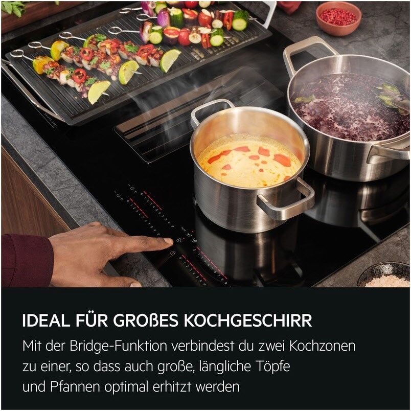 AEG 6000 Bridge XTM Induktionskochfelder mit integriertem DunstabzugDie 6000 Bridge XTM Kochfelder haben einen leistungsstarken integrierten Dunstabzug und ermöglichen den Einbau in einen 60 cm Küchenschrank. Zudem bieten sie mit der Bridge-Funktion die Möglichkeit zwei Kochzonen zu einer großen zu verbinden, sodass auch großes Kochgeschirr optimal erhitzt wird.