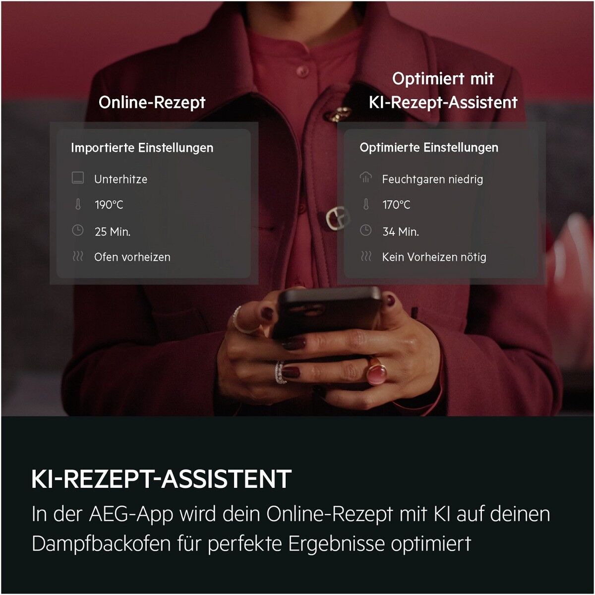 Dampfbacköfen der Serie 9000 mit SteamPro und Sous Vide ermöglichen es dir deine Gerichte mit Profi- Kochtechniken zuzubereiten. Wähle zwischen 100 % Dampf, Dampfkombinationen, Regenerieren, Steamify® und Sous Vide garen. Dabei werden bis zu 90% des Vitamin Cs deiner Lebensmittel bewahrt.*AEG ProAssist Dampfbacköfen der Serie 9000 mit SteamPro und Sous Vide*Basierend auf externen Tests bei denen der Erhalt von Nährstoffen von Brokkoli und Lachs nach dem Dampfgaren bei niedrigen Temperaturen gemessen wurde. SteamPro mit Sous- Vide-Funktion: Zu Hause gesünder und köstlicher kochenDie Back-, Brat- und Dampffunktion des SteamPro Dampfbackofens lassen dich das Beste aus deinen Rezepten herausholen. Steamify fügt immer die richtige Menge Dampf hinzu und macht dein Lieblingsessen knusprig und schmackhaft. Die Sous Vide- Funktion ermöglicht dir Kochergebnisse in Profi-Qualität.SteamPro mit Sous-Vide-Funktion: Zu Hause gesünder und köstlicher kochen CookSmart Touch+ Display: Personalisiert und effizientDas extra große CookSmart Touch+ Display führt dich zu perfekten Ergebnissen und hilft dir, Energie zu sparen. Deine Lieblingsgerichte und Rezepte kannst du auf dem Startbildschirm abspeichern und mit nur einem Fingertipp abrufen. Für ein noch intuitiveres Kocherlebnis verbinde dich mit der AEG App. AEG KI-Rezept-Assistent: Verfeinert traditionelle Rezepte mit DampfDer AEG KI-Rezept-Assistent hilft dir dabei, traditionelle Rezepte mit Dampf zu verfeinern. Verwende die AEG App, um ein Online-Rezept an deinen Ofen zu senden. Die KI ermittelt die optimale Zeit, Temperatur und Programme für gesündere, köstlichere Gerichte.Der KI-Rezept-Assistent der AEG App ist aktuell in den folgenden Sprachen verfügbar: Deutsch, Französisch, Italienisch, Schwedisch und Niederländisch. CookSmart Touch+ Display: Intelligente Anleitung für ein besseres KocherlebnisDas extra große CookSmart Touch+ Display ermöglicht dir eine einfache und benutzerfreundliche Touch-Bedienung. Dank intuitiver Navigation durch das Menü mit Schritt-für- Schritt-Anleitungen gelingt jedes Gericht. Für ein noch intuitiveres Kocherlebnis verbinde dich mit der AEG App. Dampfreinigung: für eine mühelose Reinigung deines DampfbackofensDie Dampfreinigungs-Funktion informiert dich, wenn es an der ist Zeit ist, deinen Dampfbackofen zu reinigen. Alle Verschmutzungen lassen sich anschließend mit einem feuchten Tuch entfernen. Diese Dampfreinigung verbraucht bis zu 95 % weniger Energie* als die pyrolytische Reinigung.