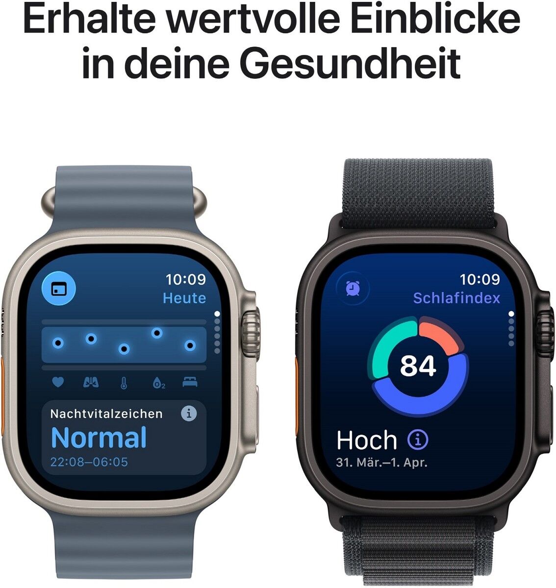 ⁸ Schlafapnoe Mitteilungen sind bei der Apple Watch Series 9 und neuer, Ultra 2 und neuer und SE 3 verfügbar. Das Feature ist dafür gedacht, Anzeichen von mittlerer bis schwerer Schlafapnoe bei Personen ab 18 Jahren ohne diagnostizierte Schlafapnoe zu erkennen.