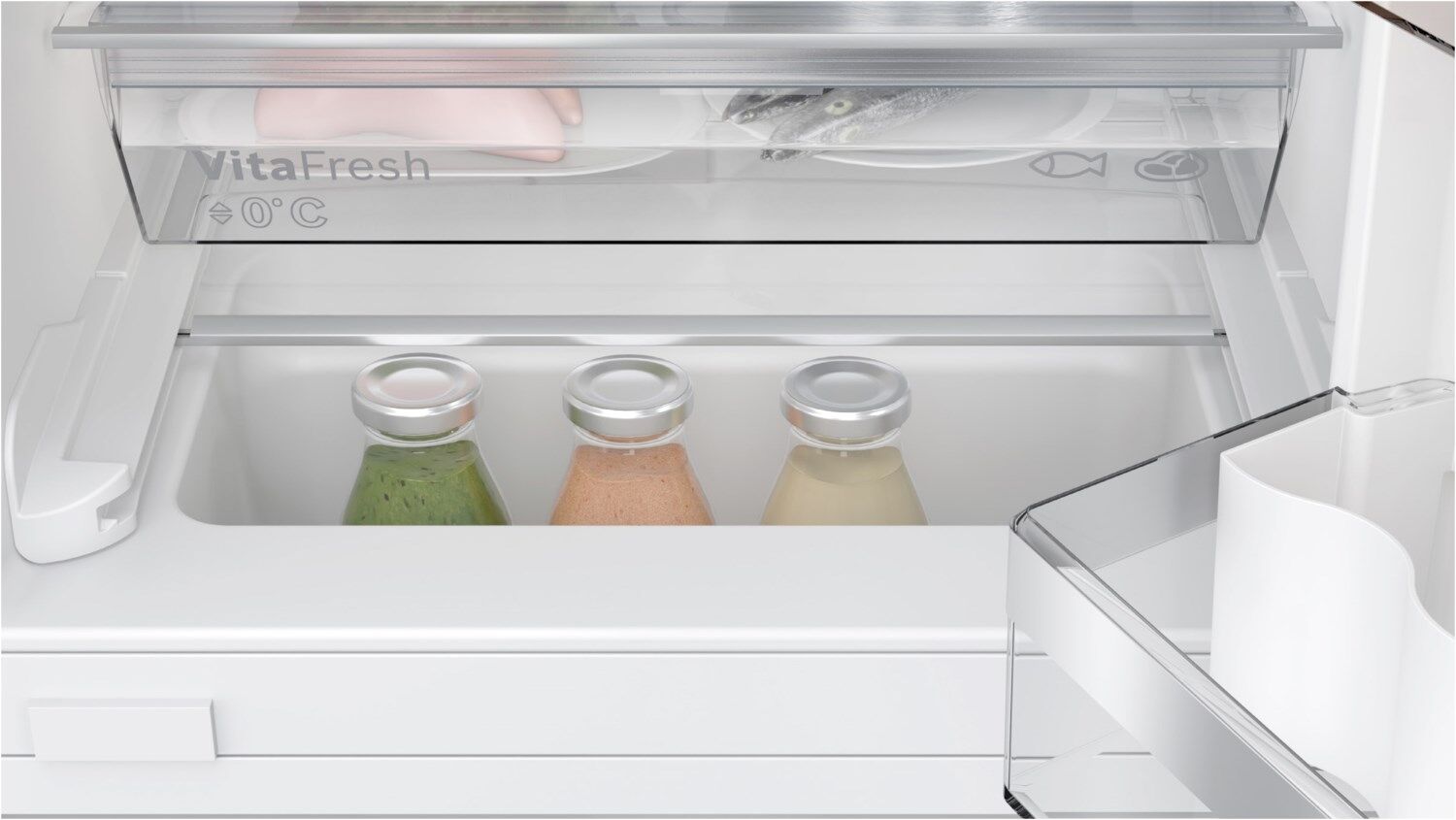 Schon geringste Temperaturschwankungen, beispielsweise durch Sonneneinstrahlung auf die Kühl-Gefrier-Kombination, können die Bedingungen im Kühlschrank beeinträchtigen – und damit auch die Frische deiner Lebensmittel. Um das zu vermeiden, misst Fresh Sense die Innen- und Außentemperatur des Kühlschranks und erkennt, wenn sich die Umgebungsbedingungen ändern. Sobald eine Änderung erkannt wird, steuert das Kontrollsystem sofort gegen, damit deine Lebensmittel frisch bleiben.