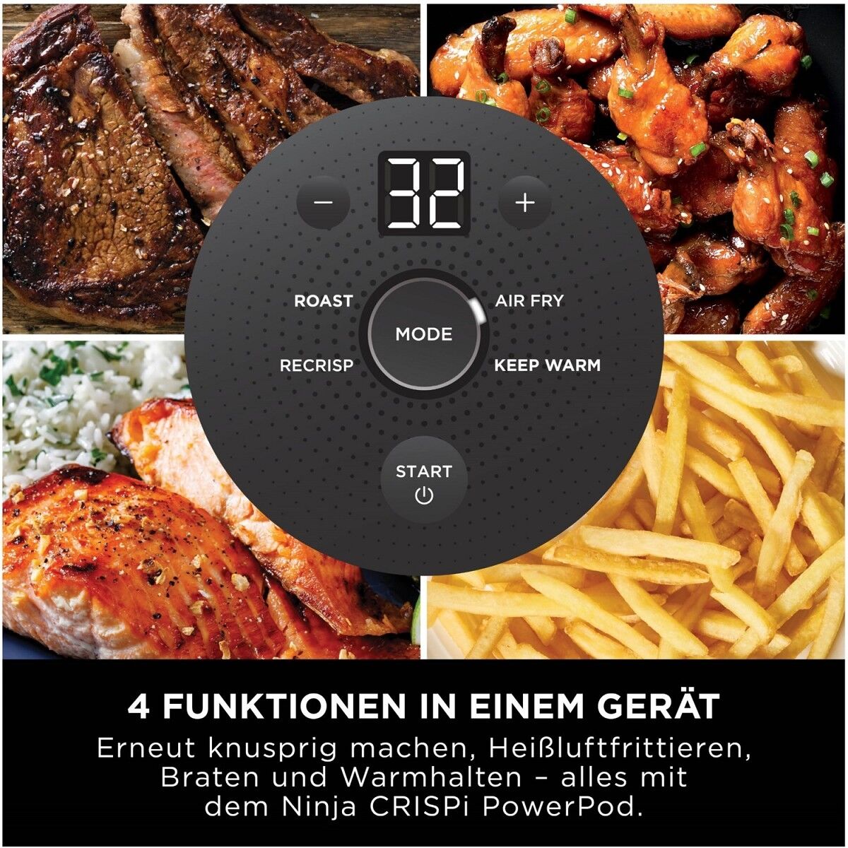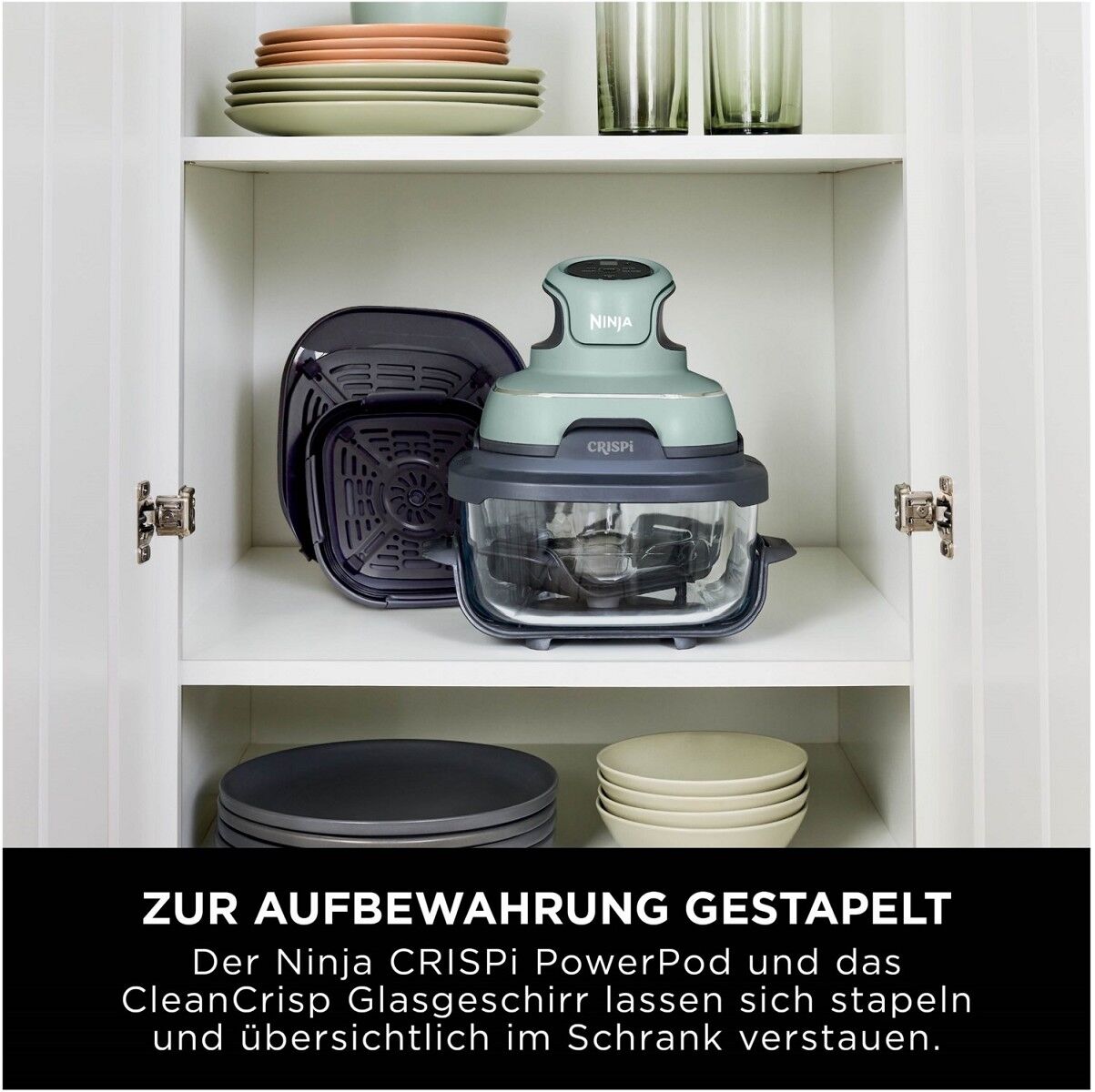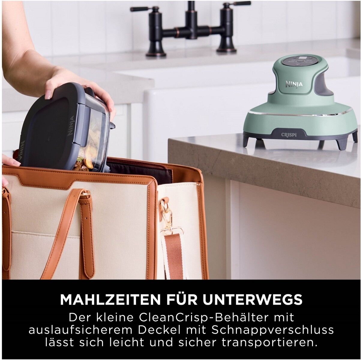 Lerne den Ninja CRISPi kennen – unsere revolutionäre, tragbare 4-in-1 Glas-Heißluftfritteuse. Leistungsstark wie eine große Heißluftfritteuse, und doch kompakt und tragbar. Ob zu Hause, im Büro oder unterwegs, mit dem CRISPi kannst du in jeder Situation ganz unkompliziert deine Lieblingsgerichte genießen. Sein handliches, tragbares Format macht es möglich: Einfach den leichten 1700-Watt-PowerPod auf einen der mitgelieferten Glasbehälter stecken, um jede Familienmahlzeit oder Einzelportion aufzupeppen.