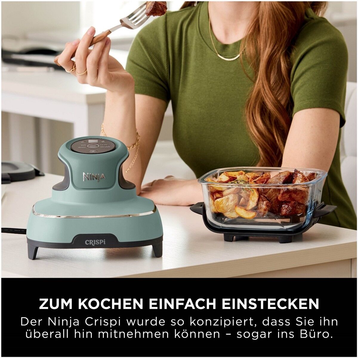 Der CRISPi hält bei jedem Alltagstrubel mit. Dank seiner leichten Transportierbarkeit kannst du ihn überallhin mitnehmen – von der Küche auf deinen Schreibtisch oder sogar zum Wochenendausflug. Wie dein Tag auch aussieht, der Ninja CRISPi hilft dir, PFAS*-frei zu kochen, gut zu essen und selbst für deine Mahlzeiten zu sorgen.